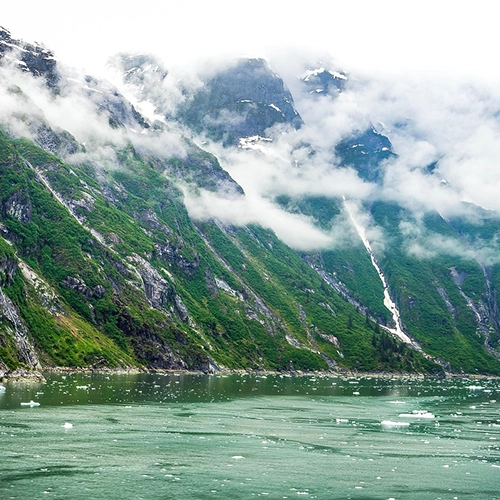 “Portage Glacier in Anchorage, US, is a majestic natural landmark, featuring massive ice formations, rugged mountain surroundings, and shimmering blue glacial waters.”