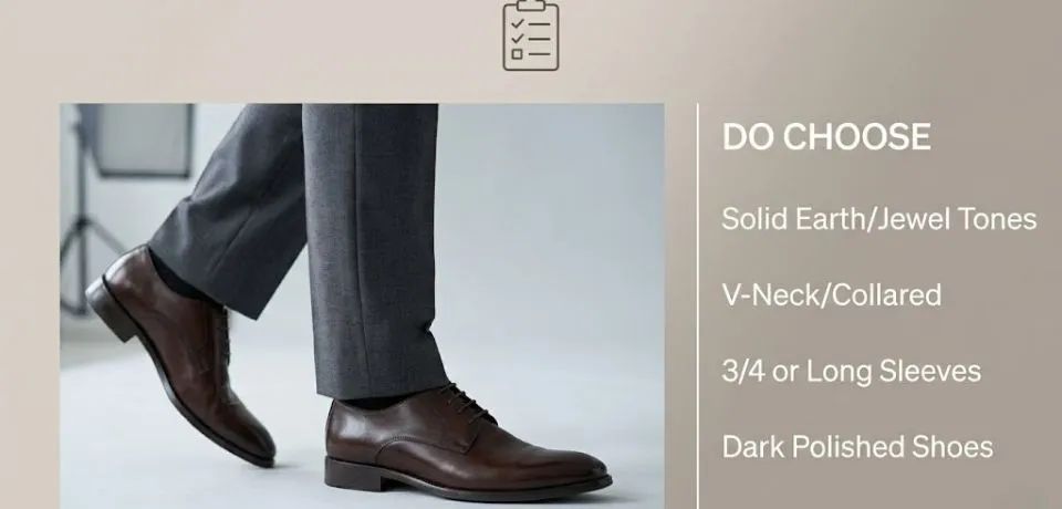 | Necklines | V-neck, boat neck, or collared | Deep plunges or distracting ruffles |